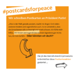 Dazu initi­ier­ten sie, betreut durch die Klas­sen­leh­re­rin Mar­ga­re­te Dere­gow­ski, das Pro­jekt #post­cards­for­peace, mit dem Ziel, eine gro­ße inter­na­tio­na­le Post­kar­ten­wel­le nach Russ­land aus­zu­lö­sen. Der Emp­fän­ger der Post­kar­ten ist Prä­si­dent Putin selbst.