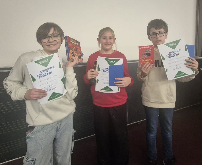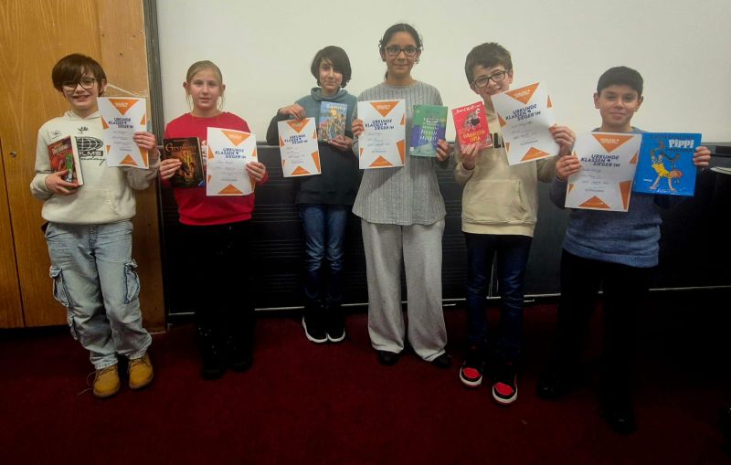 Mit Engagement und Lesefreude waren die Schüler*innen der Klassen 6 a, b und c am Start und trugen Passagen aus ihren Lieblingsbüchern vor. Die Jury aus mehreren Lehrerinnen und Lehrern sowie Laura Khalaf, einer Preisträgerin aus dem Vorjahr, bewertete Lesetechnik, Interpretation und Textstellenauswahl. Unsere diesjährigen Gewinner sind