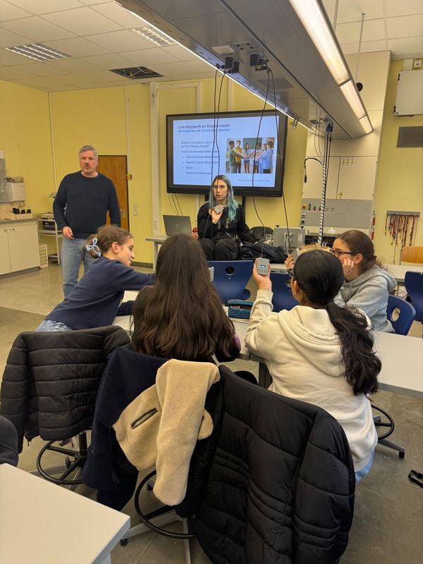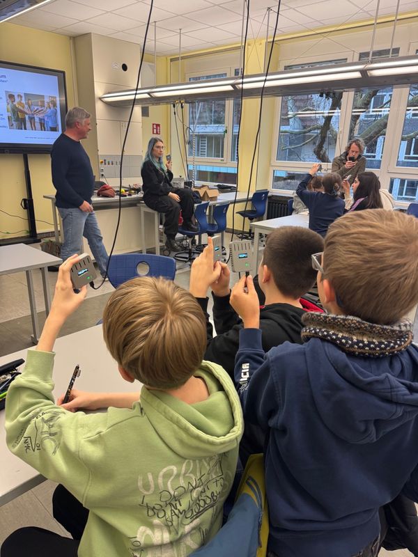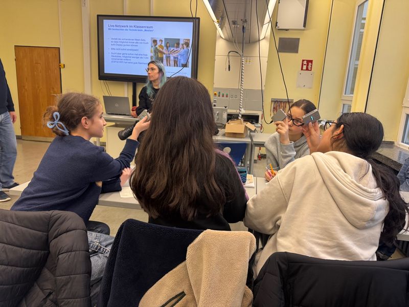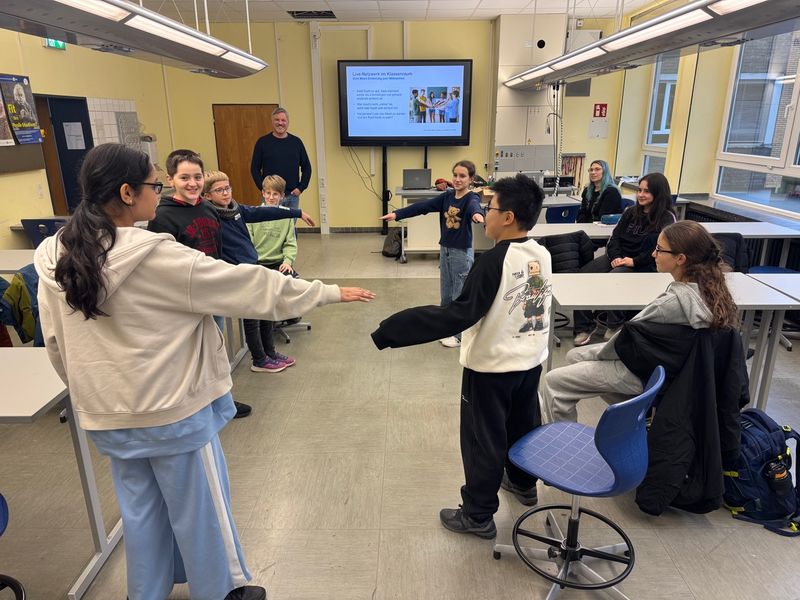 Bei der heutigen Sitzung der MINT-in-mind-AG ging es darum, das Zukunftspotenzial von Mesh-Netzwerken zu erforschen. Das Team der Hochschule Niederrhein ermöglichte den Schülerinnen und Schülern sogar, ein Mesh-Netzwerk selbst zu bauen. Ein cooles Rollenspiel, das verschiedene Situationen – z.B. Ausfall eines Parent-Nodes simulierte- , veranschaulichte das Hierarchiesystem der Nodes (Knotenpunkte): den Root‑, Parent- und Child-Nodes. Schnell wurde deutlich, dass der klare Vorteil von Mesh-Netzwerken darin liegt, dass sie sich selbstorganisiert dynamisch anpassen können, um eine optimale Signalstärke zwischen den Knotenpunkten zu garantieren.