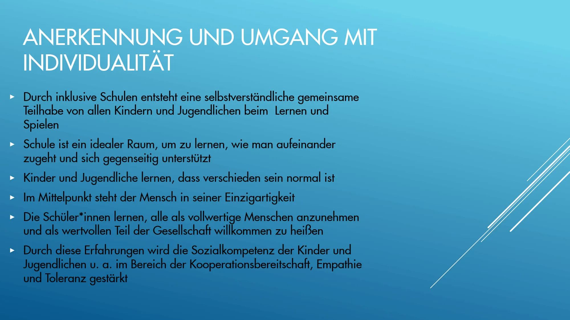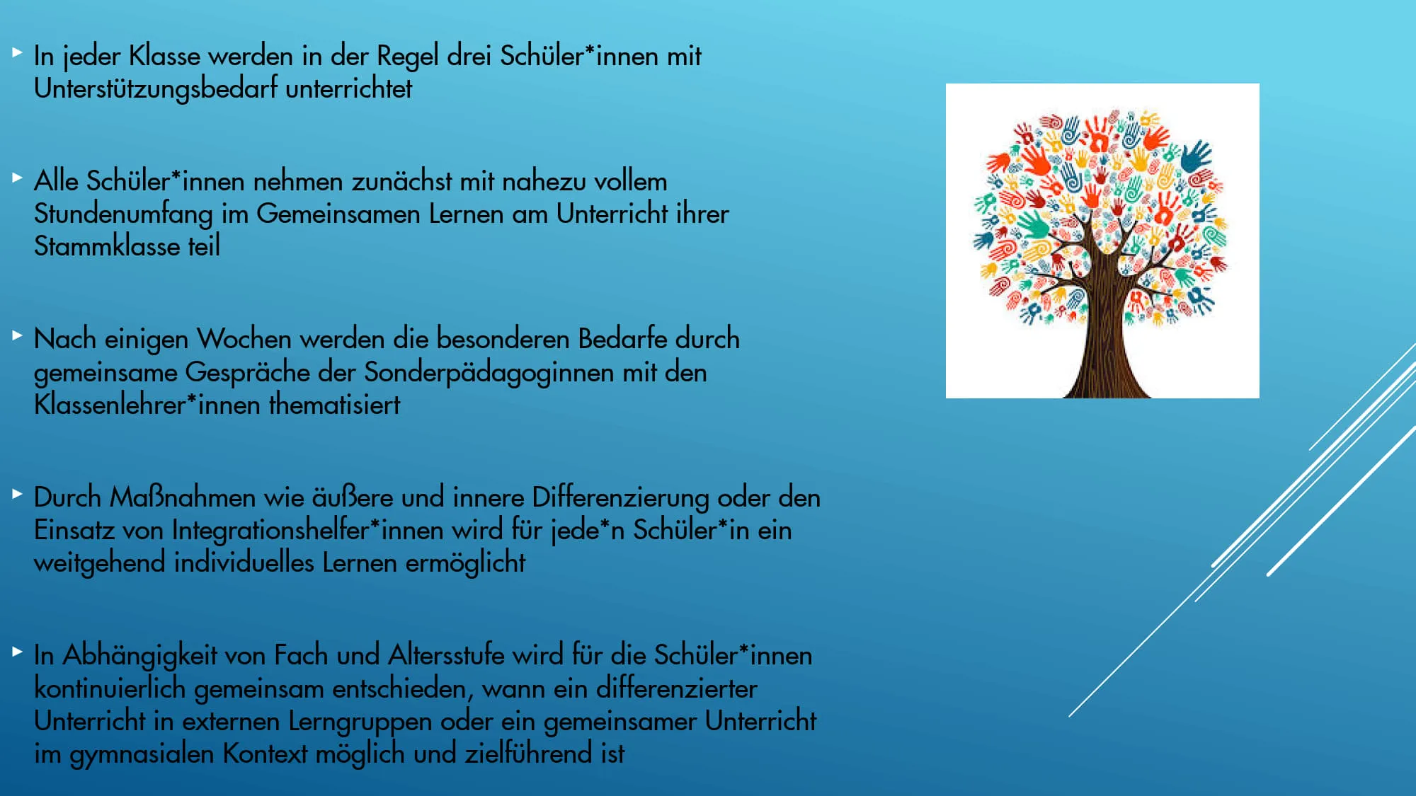 Zunächst werden mit Beginn des neuen Schuljahres alle Schüler*innen mit vollem Stundenumfang im Gemeinsamen Lernen unterrichtet. In den ersten Unterrichtswochen werden die besonderen Bedarfe von Schüler*innen in den Klassenleiterstunden durch die Sonderpädagoginnen thematisiert, um ein hohes Maß an Transparenz für besondere Maßnahmen zu schaffen, z. B. äußere und innere Differenzierung oder der Einsatz von Integrationshelfer*innen.